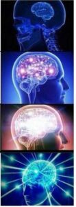 Descrição: O meme “Expanding Brain” mostra uma série de imagens de cérebros em diferentes estados de “expansão” ou “iluminação”. Cada nível de expansão cerebral representa uma forma mais complexa ou “elevada” de pensar, muitas vezes com uma dose de ironia.